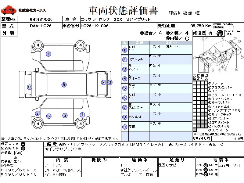 | メーカー・車種 | 日産 セレナ 20X_HV (型式:DAA-HC26) | ||||||||||||||||||||||||||||||||||||||||