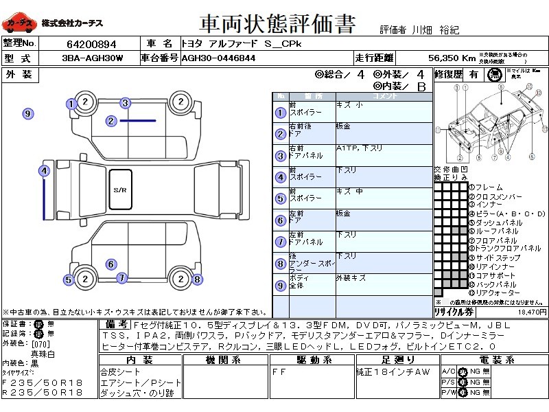 | メーカー・車種 | トヨタ アルファード S_CPk (型式:3BA-AGH30W) | ||||||||||||||||||||||||||||||||||||||||