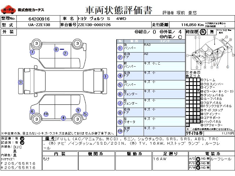| メーカー・車種 | トヨタ ヴォルツ S (型式:UA-ZZE138) | ||||||||||||||||||||||||||||||||||||||||