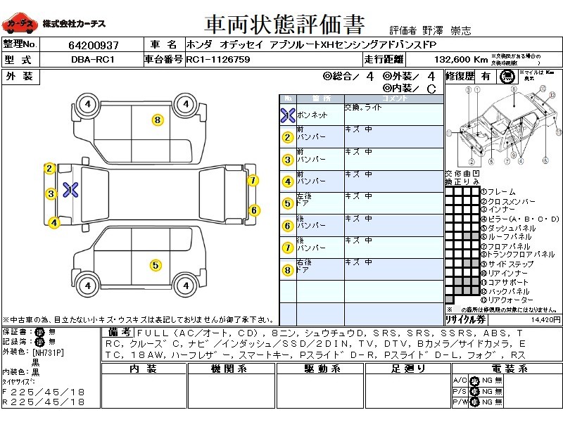 | メーカー・車種 | ホンダ オデッセイ アブソルートXHセンシングアドバンスドP (型式:DBA-RC1) | ||||||||||||||||||||||||||||||||||||||||