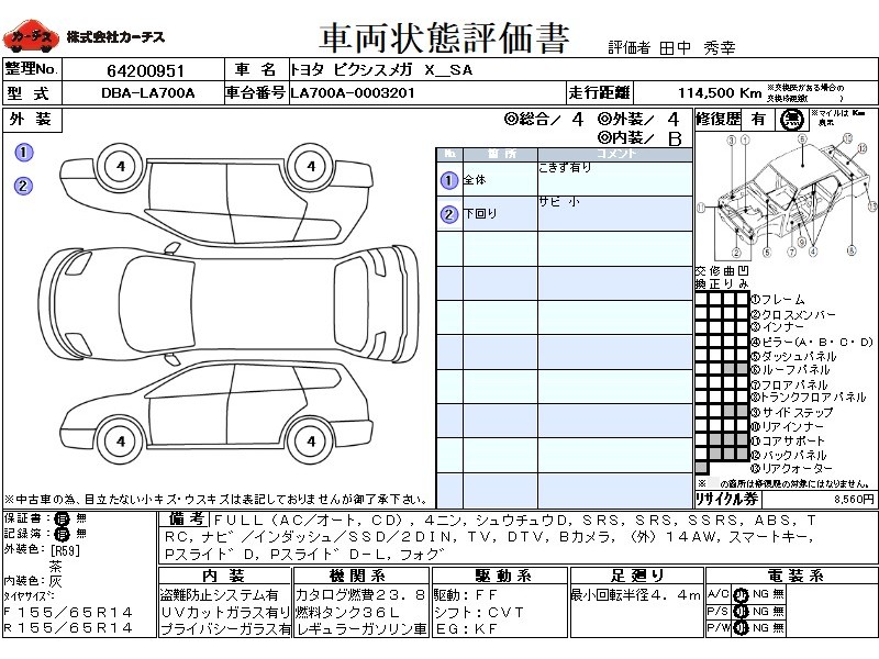 | メーカー・車種 | トヨタ ピクシスメガ X_SA (型式:DBA-LA700A) | ||||||||||||||||||||||||||||||||||||||||