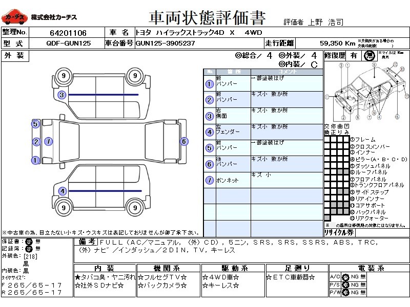 | メーカー・車種 | トヨタ ハイラックストラック4D X (型式:QDF-GUN125) | ||||||||||||||||||||||||||||||||||||||||