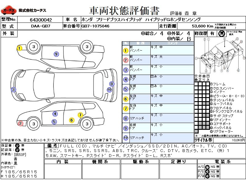 | メーカー・車種 | ホンダ フリードプラスハイブリッド ハイブリッドGホンダセンシング (型式:DAA-GB7) | ||||||||||||||||||||||||||||||||||||||||