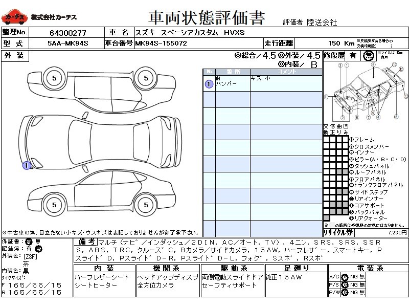 | メーカー・車種 | スズキ スペーシアカスタム HVXS (型式:5AA-MK94S) | ||||||||||||||||||||||||||||||||||||||||