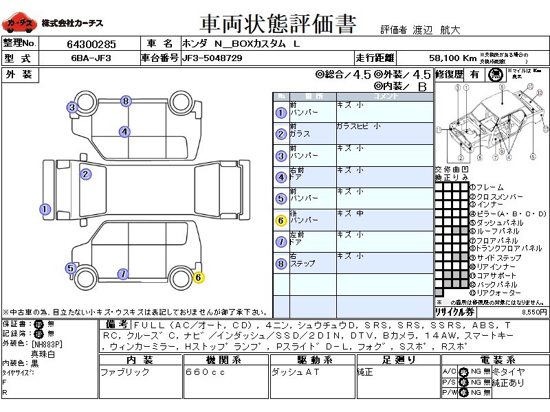 | メーカー・車種 | ホンダ N BOXカスタム L (型式:6BA-JF3) | ||||||||||||||||||||||||||||||||||||||||