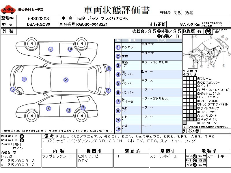 | メーカー・車種 | トヨタ パッソ プラスハナCPk (型式:DBA-KGC30) | ||||||||||||||||||||||||||||||||||||||||