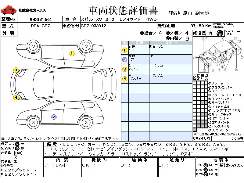 | メーカー・車種 | スバル XV 2.0i-Lアイサイト (型式:DBA-GP7) | ||||||||||||||||||||||||||||||||||||||||