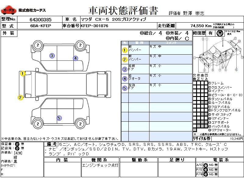 | メーカー・車種 | マツダ CX-5 20Sプロアクティブ (型式:6BA-KFEP) | ||||||||||||||||||||||||||||||||||||||||