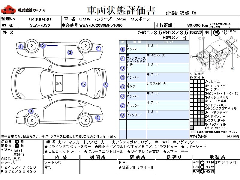 | メーカー・車種 | BMW 7シリーズ 745e_Mスポーツ (型式:3LA-7D30) | ||||||||||||||||||||||||||||||||||||||||