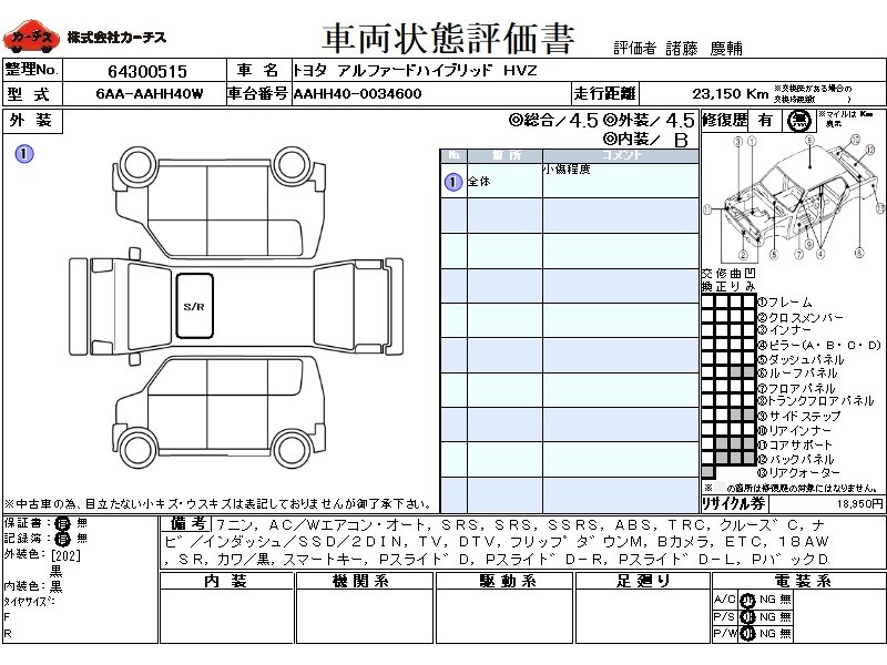 | メーカー・車種 | トヨタ アルファードハイブリッド HVZ (型式:6AA-AAHH40W) | ||||||||||||||||||||||||||||||||||||||||