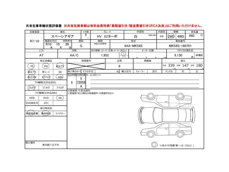 | メーカー・車種 | スズキ スペーシアギア ハイブリッドXZターボ (型式:4AA-MK54S) | ||||||||||||||||||||||||||||||||||||||||