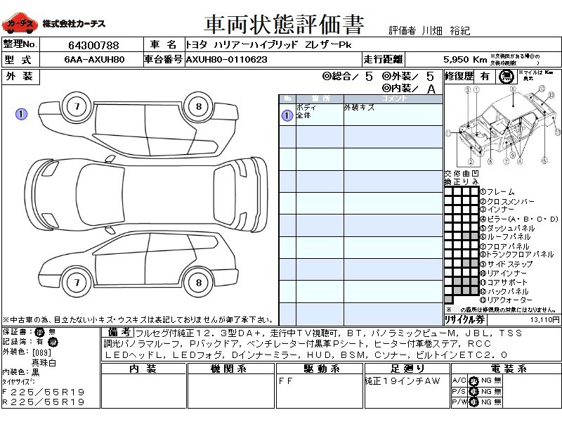 | メーカー・車種 | トヨタ ハリアーハイブリッド ZレザーPk (型式:6AA-AXUH80) | ||||||||||||||||||||||||||||||||||||||||