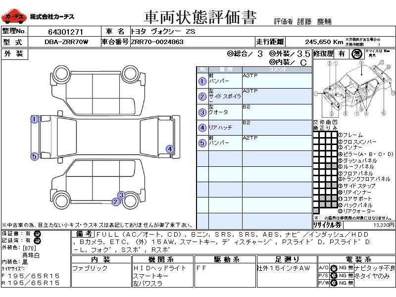 | メーカー・車種 | トヨタ ヴォクシー ZS (型式:DBA-ZRR70W) | ||||||||||||||||||||||||||||||||||||||||