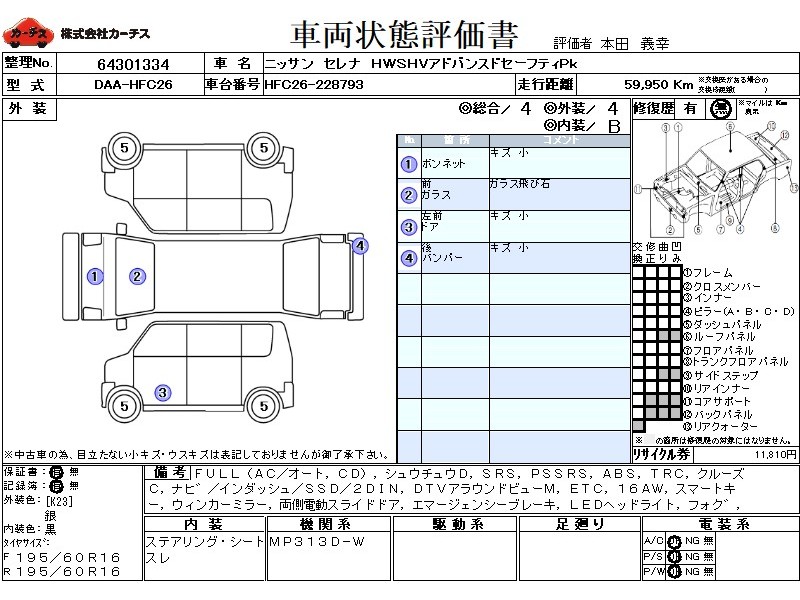 | メーカー・車種 | 日産 セレナ HWSHVアドバンスドセーフティPk (型式:DAA-HFC26) | ||||||||||||||||||||||||||||||||||||||||