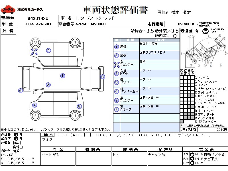 | メーカー・車種 | トヨタ ノア Xリミテッド (型式:CBA-AZR60G) | ||||||||||||||||||||||||||||||||||||||||
