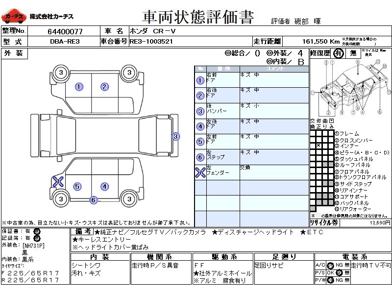 | メーカー・車種 | ホンダ CR-V ZL (型式:DBA-RE3) | ||||||||||||||||||||||||||||||||||||||||