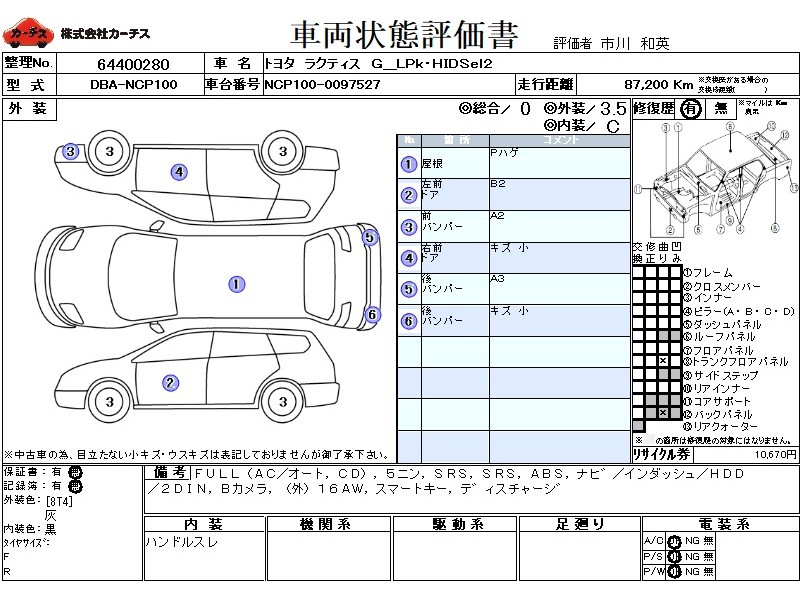 | メーカー・車種 | トヨタ ラクティス G_LPk・HIDSel2 (型式:DBA-NCP100) | ||||||||||||||||||||||||||||||||||||||||