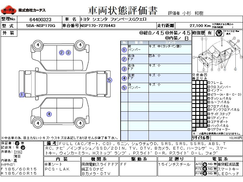 | メーカー・車種 | トヨタ シエンタ ファンベースGクエロ (型式:5BA-NSP170G) | ||||||||||||||||||||||||||||||||||||||||
