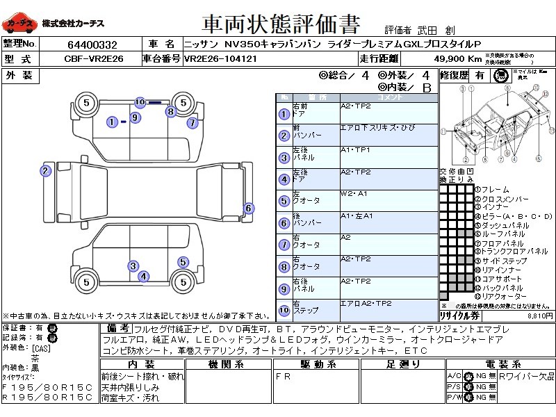 | メーカー・車種 | 日産 NV350キャラバンバン ライダープレミアムGXLプロスタイルP (型式:CBF-VR2E26) | ||||||||||||||||||||||||||||||||||||||||
