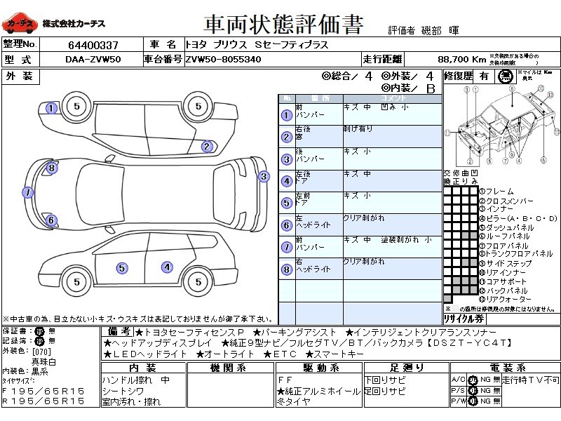 | メーカー・車種 | トヨタ プリウス Sセーフティプラス (型式:DAA-ZVW50) | ||||||||||||||||||||||||||||||||||||||||