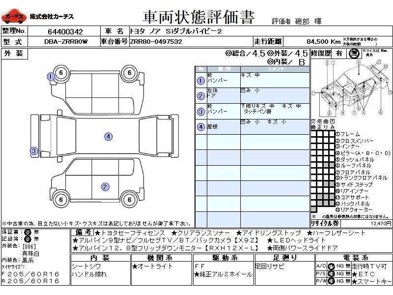 | メーカー・車種 | トヨタ ノア Siダブルバイビー2 (型式:DBA-ZRR80W) | ||||||||||||||||||||||||||||||||||||||||