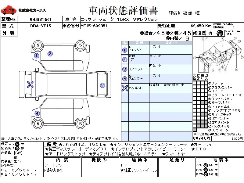 | メーカー・車種 | 日産 ジューク 15RX_VSel (型式:DBA-YF15) | ||||||||||||||||||||||||||||||||||||||||