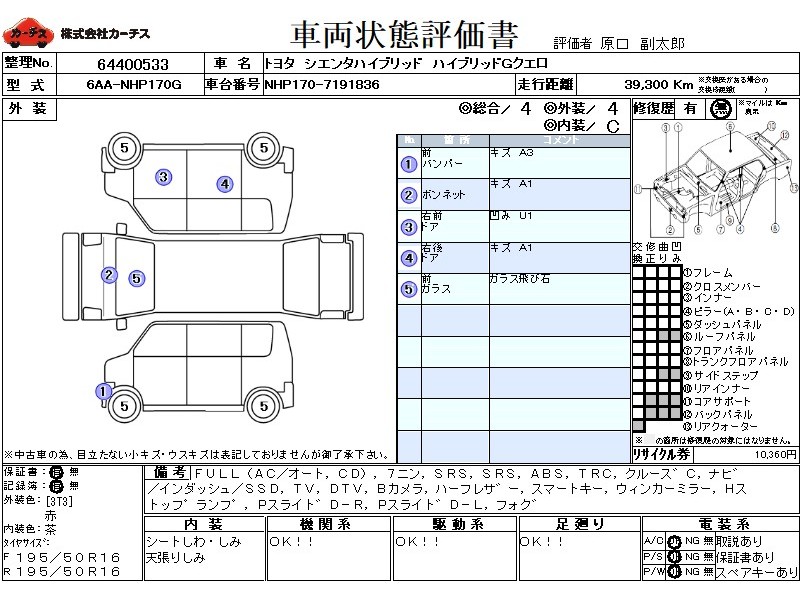 | メーカー・車種 | トヨタ シエンタハイブリッド ハイブリッドGクエロ (型式:6AA-NHP170G) | ||||||||||||||||||||||||||||||||||||||||