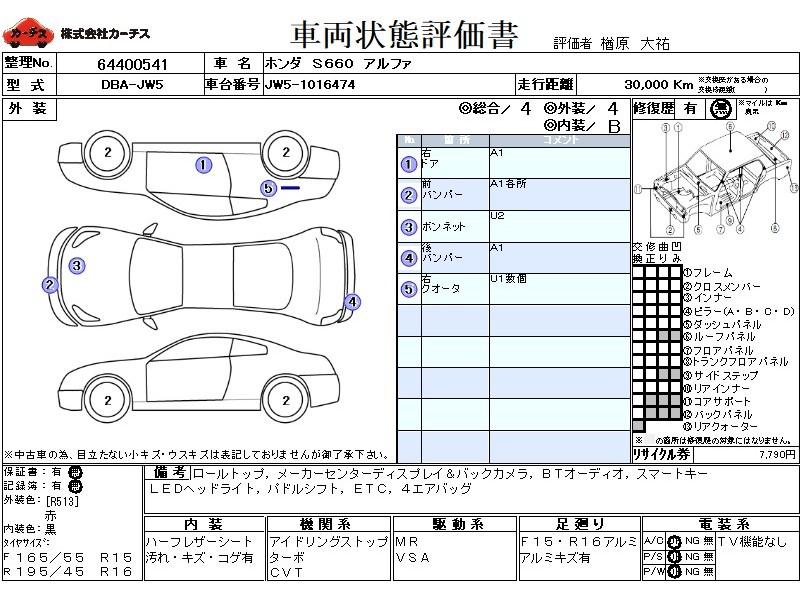 | メーカー・車種 | ホンダ S660 アルファ (型式:DBA-JW5) | ||||||||||||||||||||||||||||||||||||||||