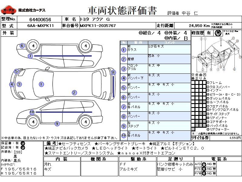 | メーカー・車種 | トヨタ アクア G (型式:6AA-MXPK11) | ||||||||||||||||||||||||||||||||||||||||