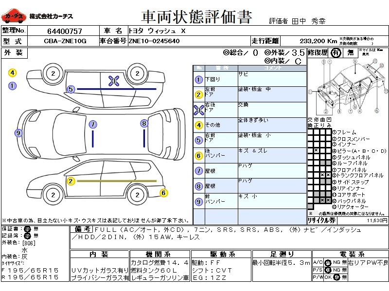 | メーカー・車種 | トヨタ ウィッシュ X (型式:CBA-ZNE10G) | ||||||||||||||||||||||||||||||||||||||||