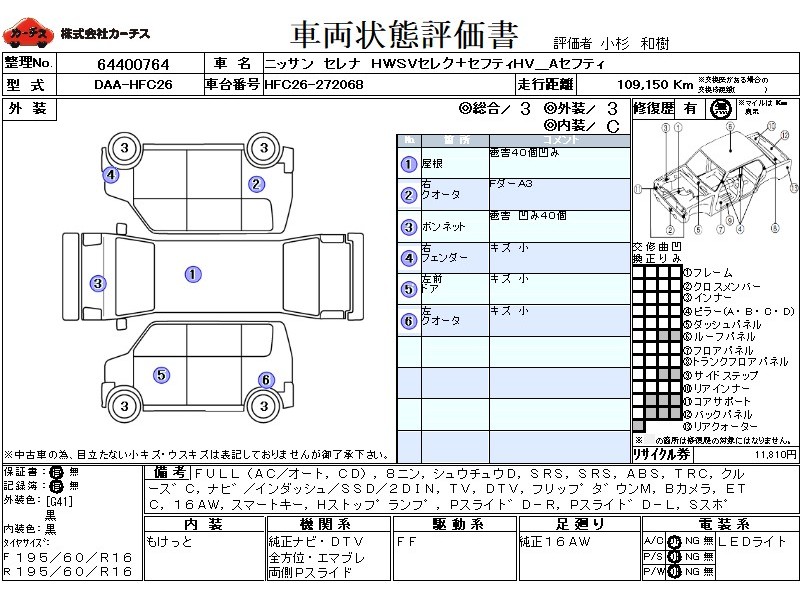 | メーカー・車種 | 日産 セレナ HWSVセレク+セフティHV_Aセフティ (型式:DAA-HFC26) | ||||||||||||||||||||||||||||||||||||||||
