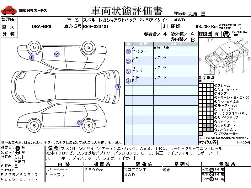 | メーカー・車種 | スバル レガシィアウトバック 2.5iアイサイト (型式:DBA-BR9) | ||||||||||||||||||||||||||||||||||||||||