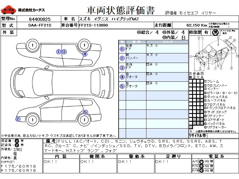 | メーカー・車種 | スズキ イグニス ハイブリッドMZ (型式:DAA-FF21S) | ||||||||||||||||||||||||||||||||||||||||