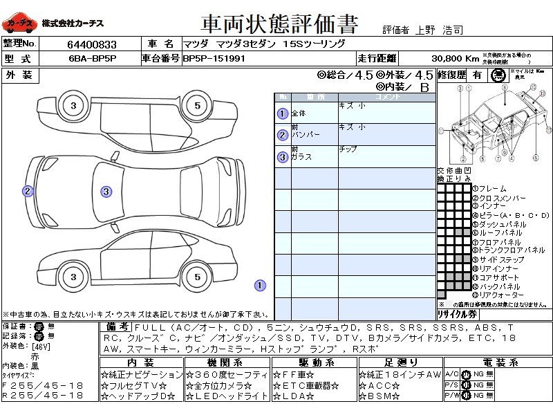 | メーカー・車種 | マツダ マツダ3セダン 15Sツーリング (型式:6BA-BP5P) | ||||||||||||||||||||||||||||||||||||||||
