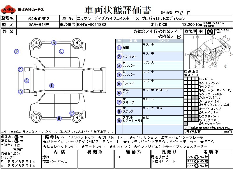 | メーカー・車種 | 日産 デイズハイウェイスター ハイウェイスターXプロパイロットEd (型式:5AA-B44W) | ||||||||||||||||||||||||||||||||||||||||