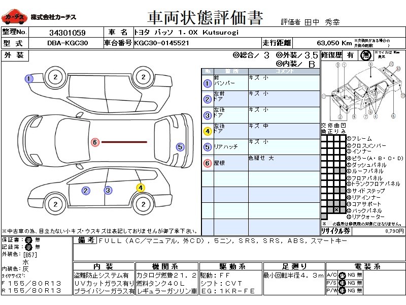 | メーカー・車種 | トヨタ パッソ Xクツロギ (型式:DBA-KGC30) | ||||||||||||||||||||||||||||||||||||||||