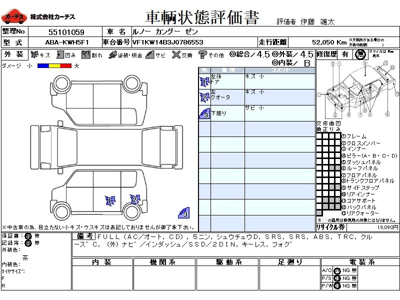| メーカー・車種 | ルノー カングー ゼン (型式:ABA-KWH5F1) | ||||||||||||||||||||||||||||||||||||||||