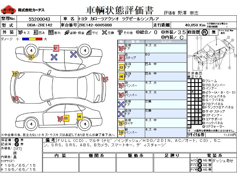| メーカー・車種 | トヨタ カローラアクシオ ラグゼールシンプレア (型式:DBA-ZRE142) | ||||||||||||||||||||||||||||||||||||||||