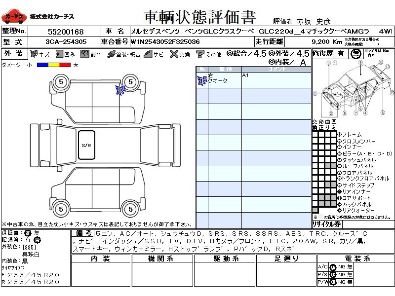 | メーカー・車種 | メルセデスベンツ GLCクラスクーペ GLC220d_4MクーペAMGライン (型式:3CA-254305) | ||||||||||||||||||||||||||||||||||||||||