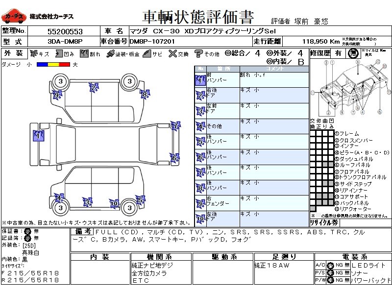 | メーカー・車種 | マツダ CX-30 XDプロアクティブツーリングSel (型式:3DA-DM8P) | ||||||||||||||||||||||||||||||||||||||||