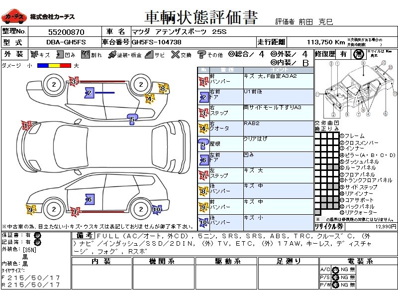 | メーカー・車種 | マツダ アテンザスポーツ 25S (型式:DBA-GH5FS) | ||||||||||||||||||||||||||||||||||||||||