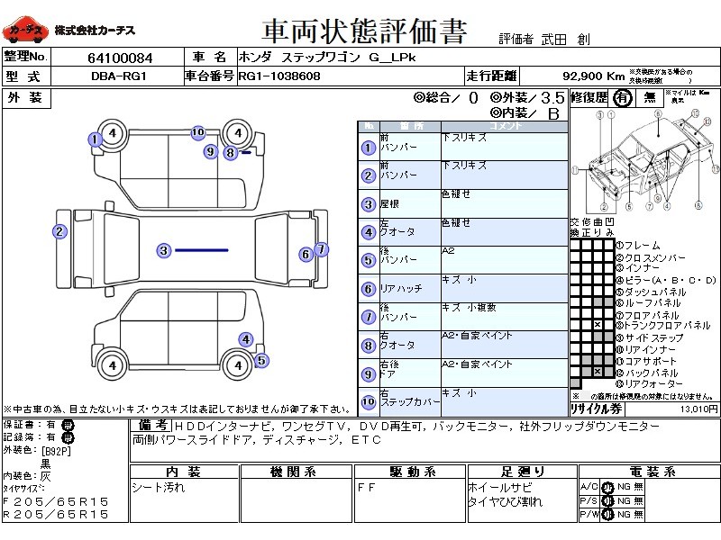 | メーカー・車種 | ホンダ ステップワゴン G_LPk (型式:DBA-RG1) | ||||||||||||||||||||||||||||||||||||||||