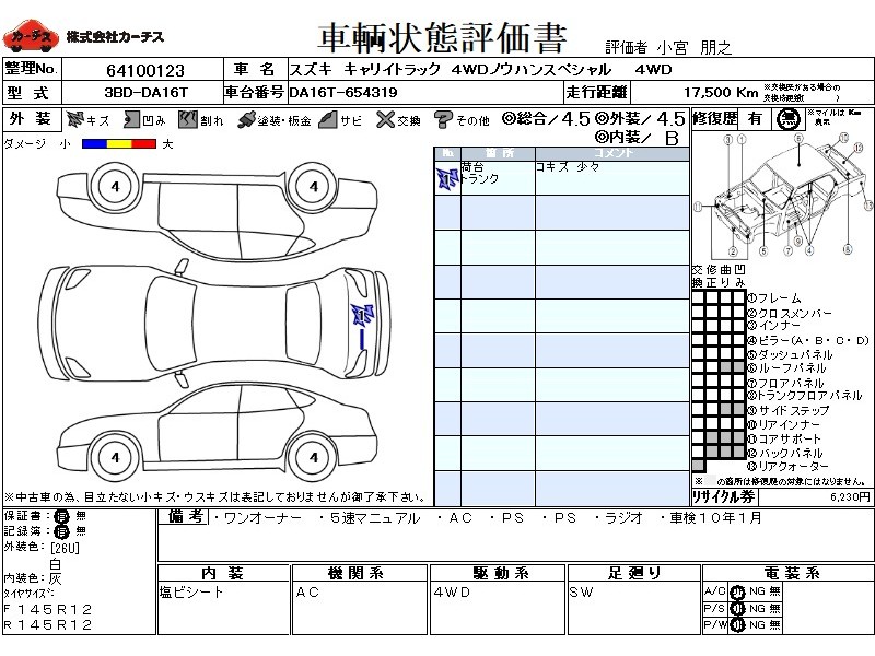 | メーカー・車種 | スズキ キャリイトラック 4WDノウハンスペシャル (型式:3BD-DA16T) | ||||||||||||||||||||||||||||||||||||||||