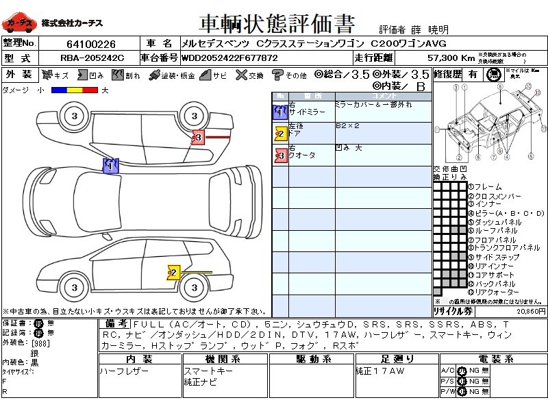 | メーカー・車種 | メルセデスベンツ Cクラスステーションワゴン C200ワゴンAVG (型式:RBA-205242C) | ||||||||||||||||||||||||||||||||||||||||