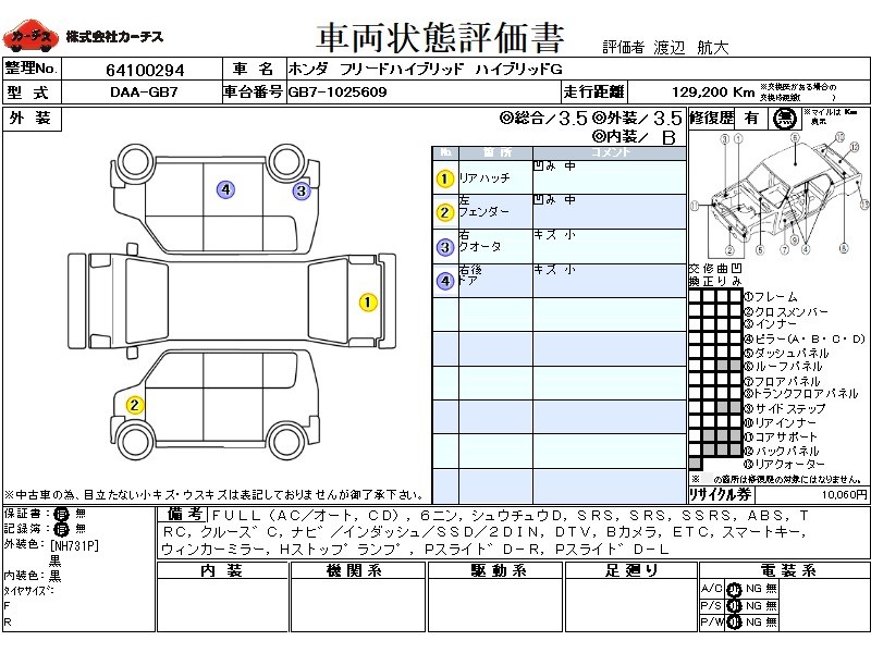 | メーカー・車種 | ホンダ フリードハイブリッド ハイブリッドG (型式:DAA-GB7) | ||||||||||||||||||||||||||||||||||||||||