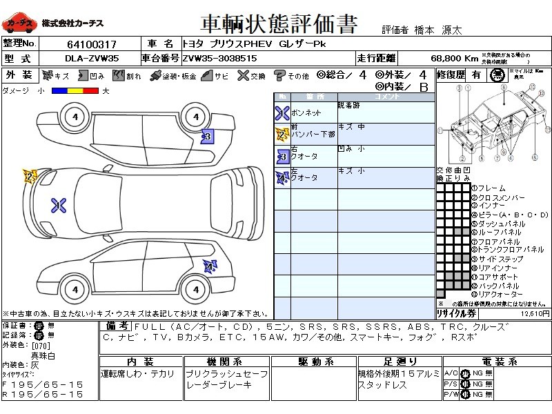 | メーカー・車種 | トヨタ プリウスPHEV GレザーPk (型式:DLA-ZVW35) | ||||||||||||||||||||||||||||||||||||||||