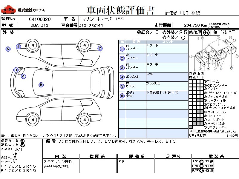 | メーカー・車種 | 日産 キューブ 15S (型式:DBA-Z12) | ||||||||||||||||||||||||||||||||||||||||