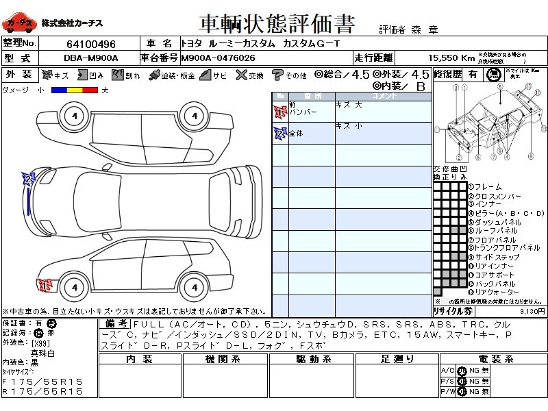 | メーカー・車種 | トヨタ ルーミーカスタム カスタムG-T (型式:DBA-M900A) | ||||||||||||||||||||||||||||||||||||||||