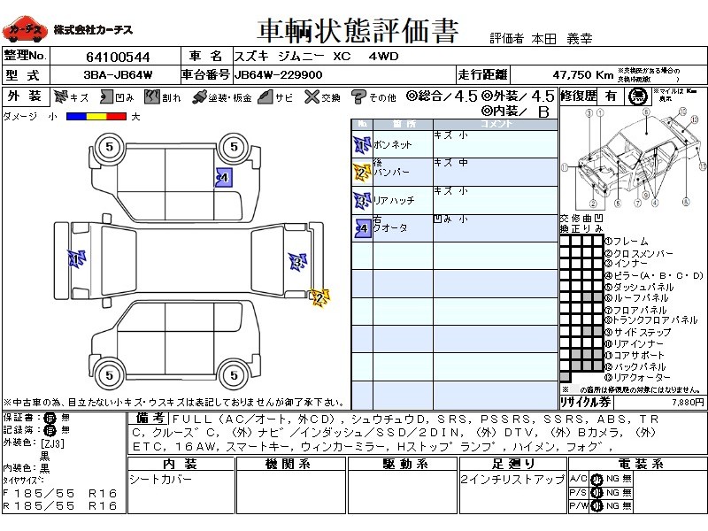 | メーカー・車種 | スズキ ジムニー XC (型式:3BA-JB64W) | ||||||||||||||||||||||||||||||||||||||||