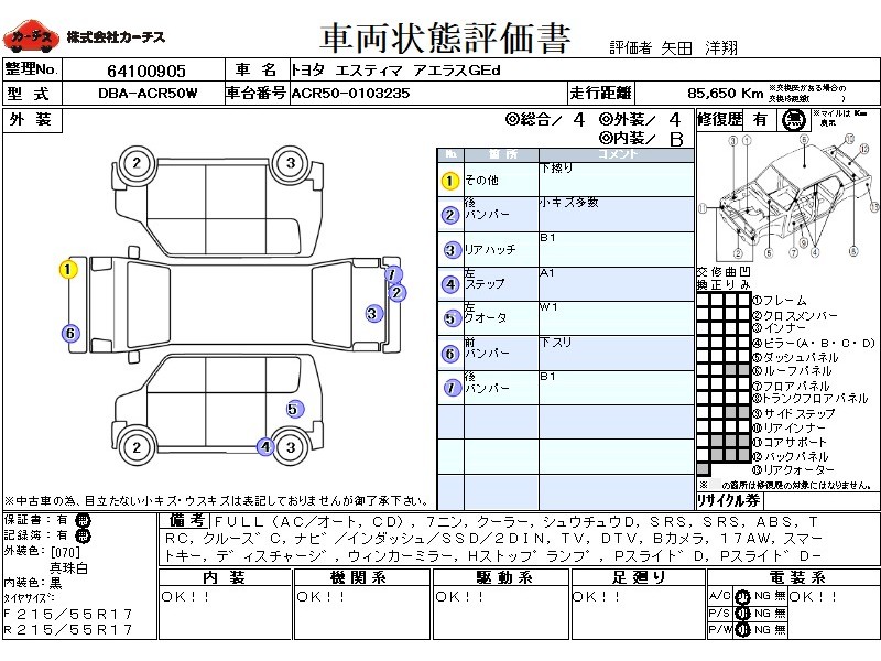 | メーカー・車種 | トヨタ エスティマ アエラスGEd (型式:DBA-ACR50W) | ||||||||||||||||||||||||||||||||||||||||